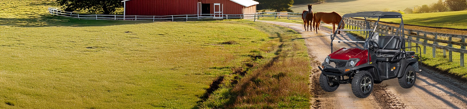 Designed for comfort, the Bighorn EV5 GVX UTV offers a smooth ride with its independent McPherson front suspension and independent double A-arm rear suspension. The 10-inch ground clearance and durable tires make it well-suited for navigating uneven terrain on your farm and ranch or on local roads when you visit friends. The hydraulic disc brakes provide consistent stopping power, ensuring safety while driving. With a passenger capacity of 770 lbs, this UTV is perfect for carrying both people and cargo. Equipped with windshield, rear view mirrors, turn signals and running at a top speed of 25 mph, the EV5 can be licensed for local road use in many municipalities.